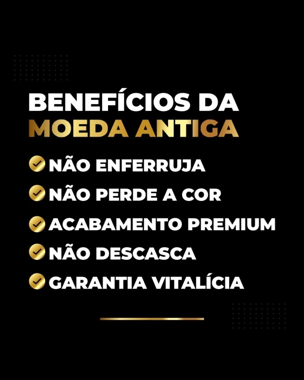 Nossas peças são feitas 100% de moeda antiga maciça, um material muito semelhante ao ouro 18K. Não mareia, não descasca, não enferruja e não perde a cor.